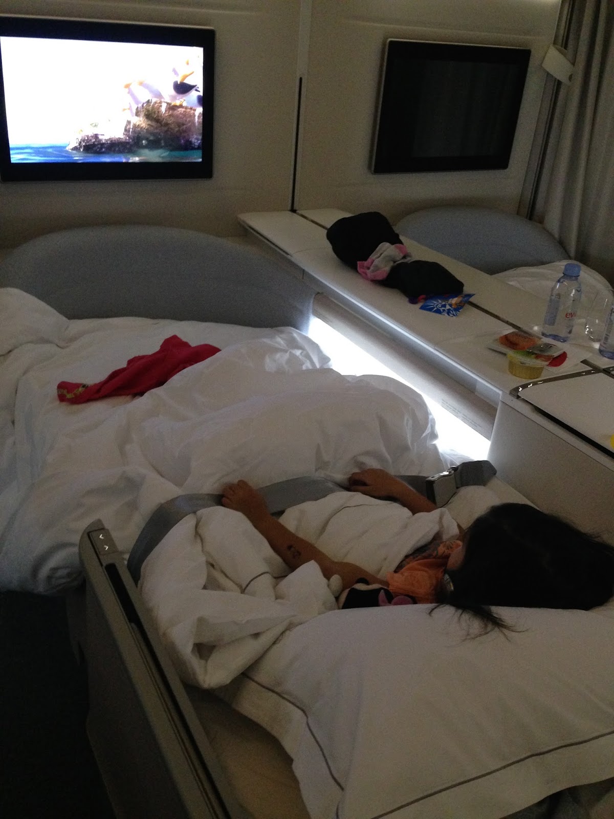 First of all, I love that my seat spanned four windows in all, meaning, it was huuuge! Also, since the First Class cabin of this Boeing 777-300ER plane only has four seats in it, we practically owned the whole cabin. Tough luck for the other person who was with us who had to endure our makulit and malikot baby.