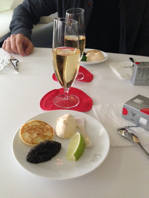 On the way back to Singapore, we had some caviar and blinis for appetizers… not really a big fan of caviar