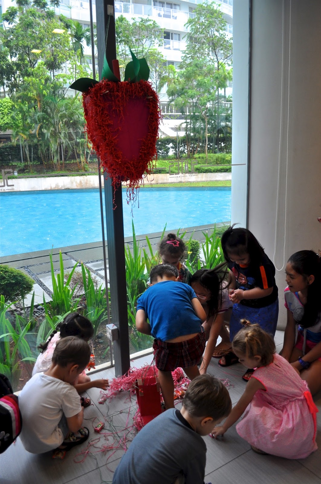 I also made my very own pull-string strawberry piñata out of some thick pink, red and green craft paper. This really took a lot of effort. I don’t think I’m ever doing it again. I will just buy the ready made one next time. It was a bit rainy outside and so I had to hang it inside the function room. Still, it was quite a success with the kids.