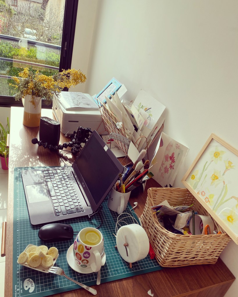 My work-from-home desk set-up. I work in I.T., don’t let those paintings and paintbrushes fool you. 🙂