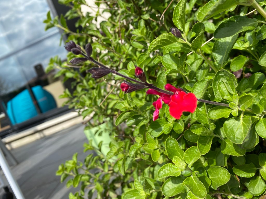 The first Sage blossom in our garden… so difficult to take a picture of anything red, though.