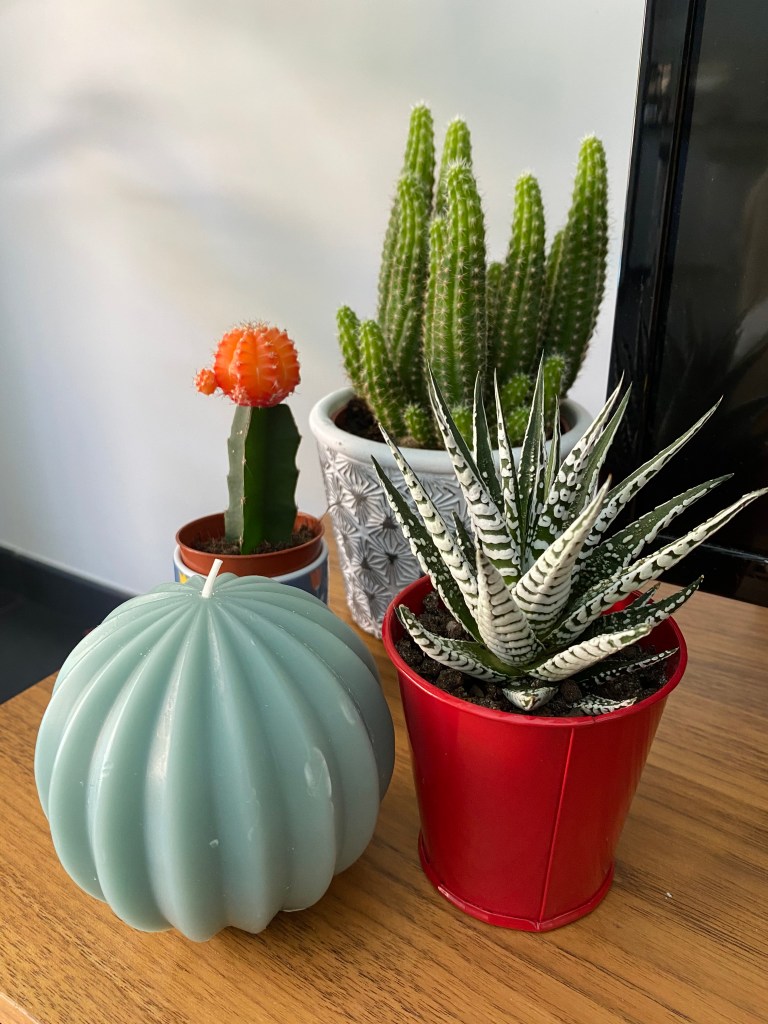 J’ai aussi quelques plantes grasses et des cactus. J’ai entendu dire qu’il est préférable de les garder près du routeur WIFI. Je n’ai pas vraiment lu l’explication scientifique de cette situation, mais je l’ai suivie aveuglément. Je n’y ai vu aucun mal de toute façon. J’ai installé certains d’entre eux dans les salles de bain parce que je sais qu’elles aiment l’humidité.